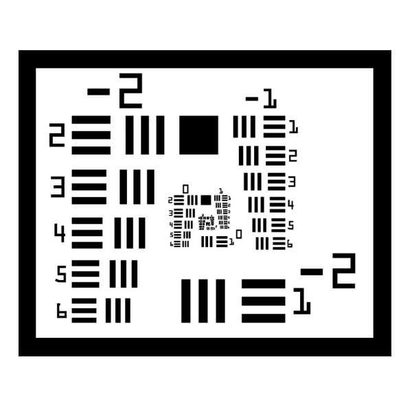 1951USAF分辨力测试图一直是世界上检测垂直与水平分辨力的通用标准,是符合MIL-STD-150A标准的分辨力测试图案,由美国*于1951年创建。这种测试图目前仍广泛地应用于测试光学成像系统(如显微镜和相机)的分辨能力。这种图案包括几组由三条短线构成组合,短线的尺寸从大到小。成像系统无法辩明的zui大短线组为其分辨能力极限。